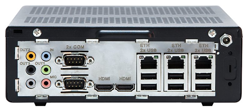 | Внешние интерфейсы | 2 порта видео с разъёмами HDMI 6 портов аудио с разъёмами «гнездо» 3,5 мм 3 порта сети Ethernet 1000Base-T с разъёмами RJ-45 6 портов периферии USB 2.0 с разъёмами типа A 2 порта консоли RS-232 с разъёмами DE-9 |
