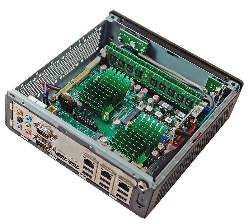 | Системный блок | корпус формата nettop, материнская плата формата Mini-ITX габариты 190×196×62 мм, вес 1,87 кг 1 преобразователь питания мощностью 120 Вт, потребление до 40 Вт 1 вентилятор под верхней крышкой (120 мм) 4 места для вентиляторов сбоку (40 мм) 4 отверстия снизу для настенного крепления VESA 100×100 мм |