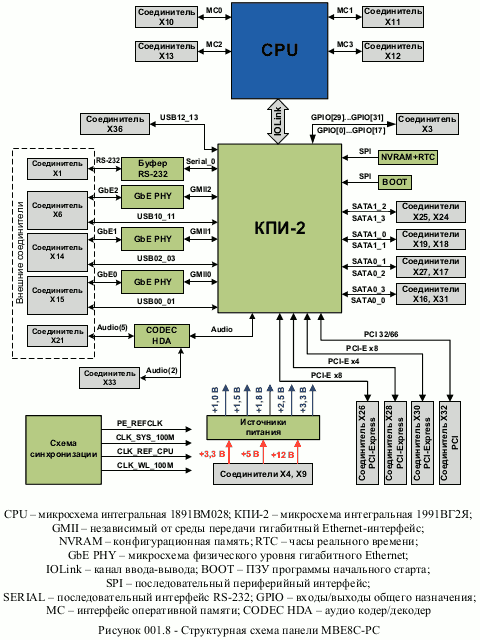 | Микросхемы | 1 центральный процессор — Эльбрус-8С (1891ВМ028) 1 контроллер периферии — КПИ-2 (1991ВГ2Я) 3 приёмопередатчика 1GbE — Marvell Alaska Ultra 88E1111 1 аудиокодек — Realtek ALC662 1 буфер RS-232 — Texas Instruments MAX3243 1 модуль памяти загрузчика (Boot) — Spansion S25FL064PIF 1 модуль памяти настроек (NVRAM+RTC) — Cypress CY14B101PA |