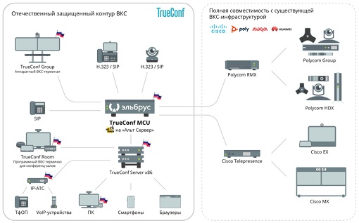 Компания TrueConf завершила разработку специализированного ПО — первого в мире серийного ВКС-решения для российской платформы «Эльбрус». В ядре ВКС-решения находится TrueConf MCU — классический программный транскодирующий сервер для многоточечных видеоконференций, который совместим с различными H.323 и SIP-терминалами. Программно-аппаратный комплекс ВКС работает под управлением специального дистрибутива операционной системы «Альт Сервер» от компании «Базальт СПО». Эта ОС работает в основном режиме процессора — двоичных кодах «Эльбрус», и служит для хранения и передачи информации в защищенной программной среде в режиме круглосуточной эксплуатации.